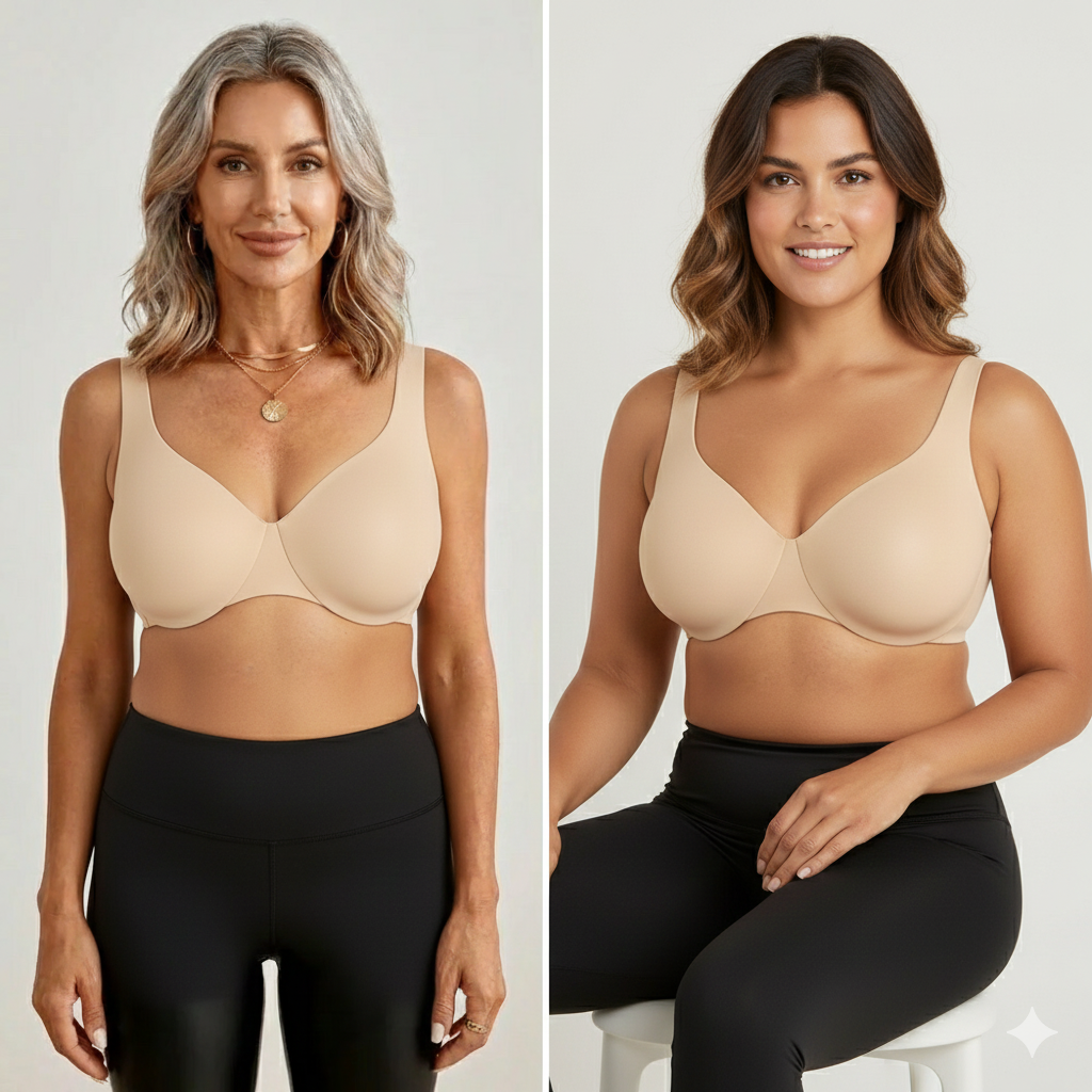 Designed for fuller busts, this bra gently minimizes while lifting and supporting for a smoother, more balanced silhouette. It redistributes weight comfortably, eliminates bulk, and stays secure all day—so you feel lighter, confident, and free.